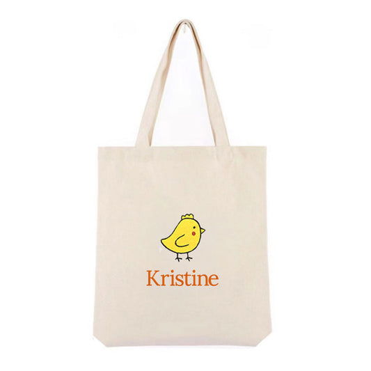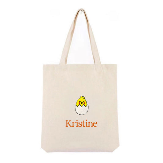 Personlig handlenett i canvas med brodert kylling i egg og tekst