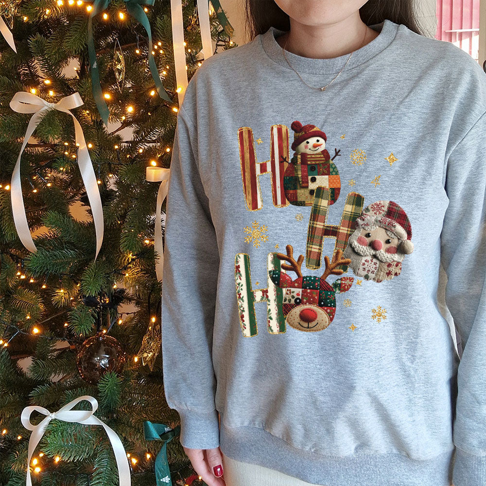 På brystet står “Ho Ho Ho” laget av tre ulike julefigurer – snømann, reinsdyr og julenisse – i lune, patchwork-inspirerte mønstre. Et motiv som føles både nostalgisk og lekent, og som passer like godt til familiejul som til juleavslutning eller juleverksted med barna.