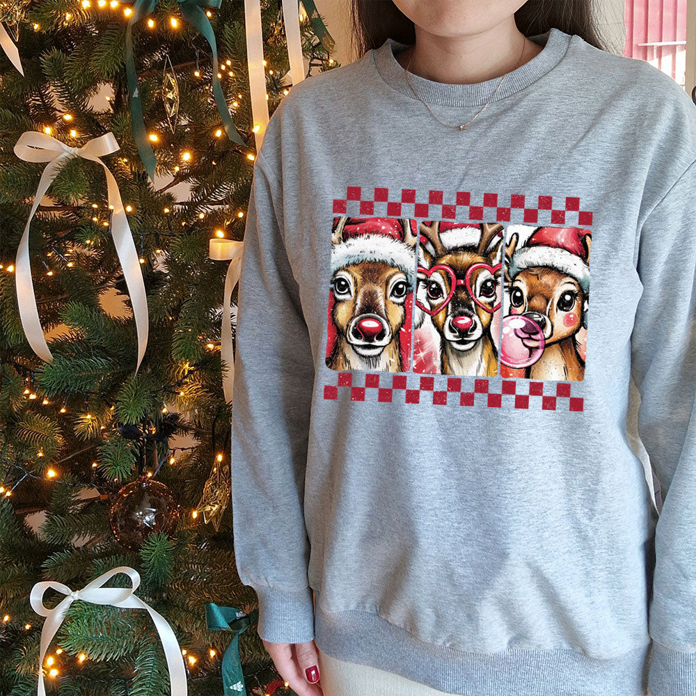 På brystet er det tre søte reinsdyr i hver sin rute – med nisseluer, briller, røde neser og tyggis-boble – rammet inn av rødrutete kant. Et motiv som både er søtt, morsomt og perfekt for deg som liker julegenser med personlighet.