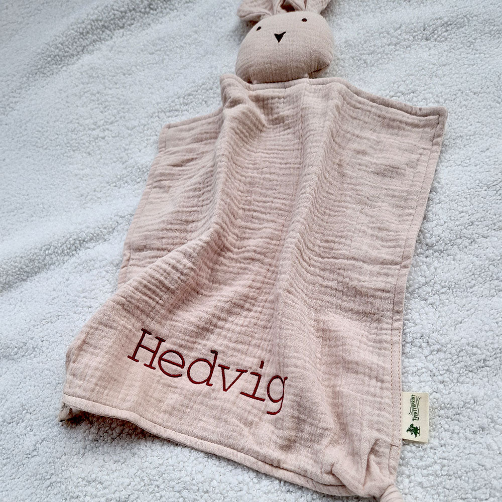 Barnets navn broderes direkte på kosekluten – en personlig detalj som gjør den helt unik og ekstra spesiell.