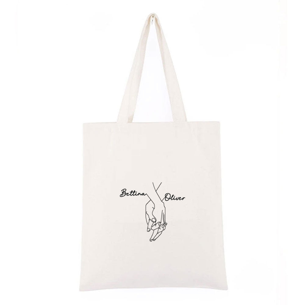 Dette personlige handlenettet i canvas er designet spesielt for Valentinsdagen, med et minimalistisk brodert motiv av to hender som holder hverandre. På hver side av motivet broderes to navn, ett navn på hver side, noe som gjør handlenettet personlig og unikt.