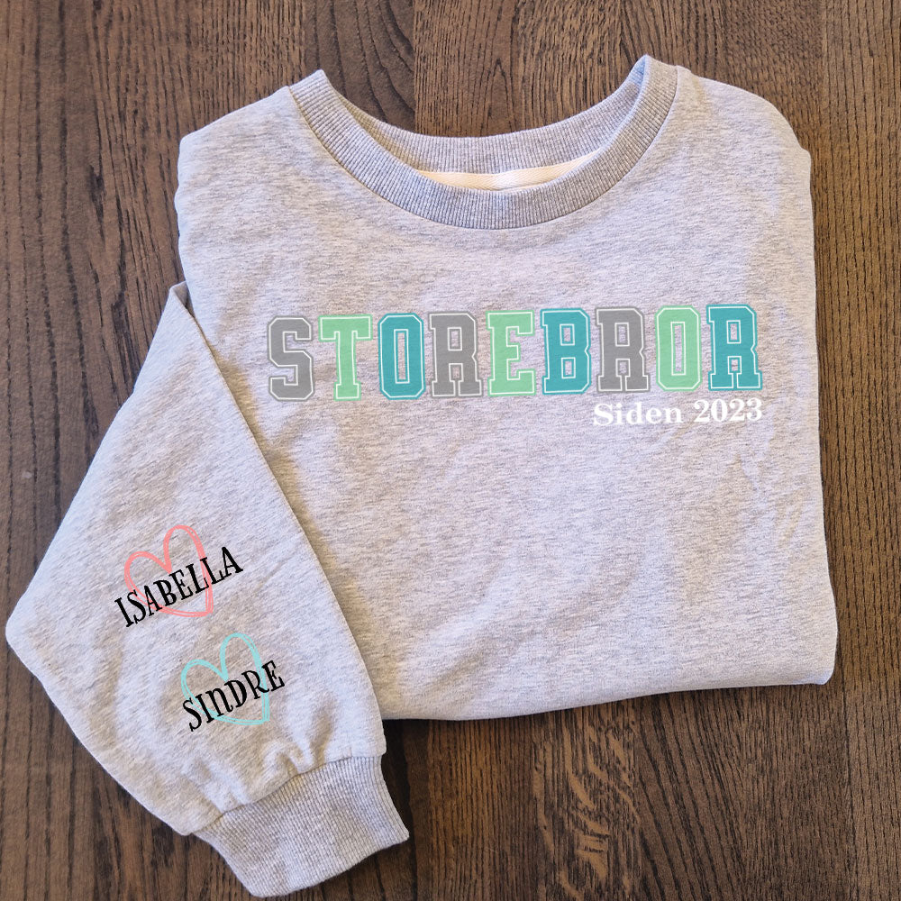 Med tittel trykket i tidløs college-skrift på brystet, og barnas navn samlet i et hjerte på høyre erme, blir genseren en personlig gave som markerer søskenbåndet på en helt spesiell måte. Perfekt til bursdag, jul eller som en overraskelse i hverdagen.