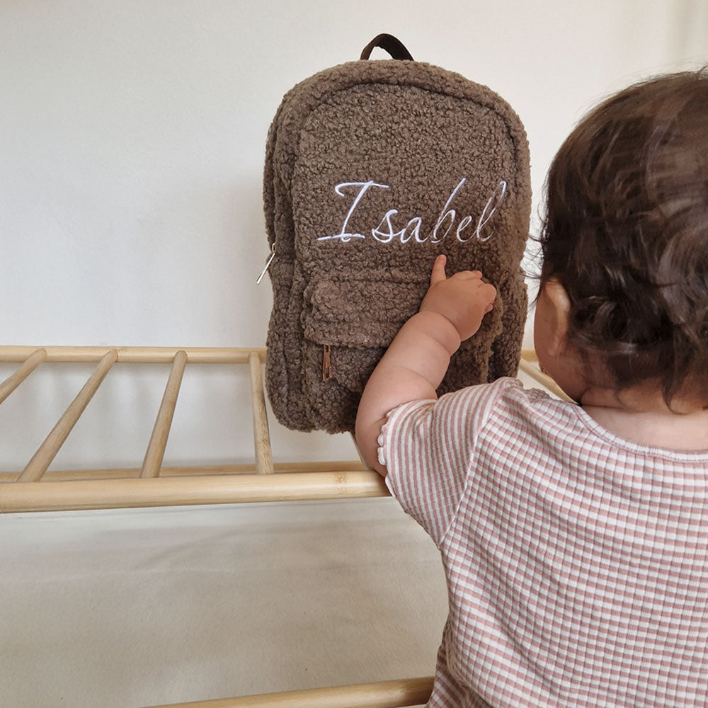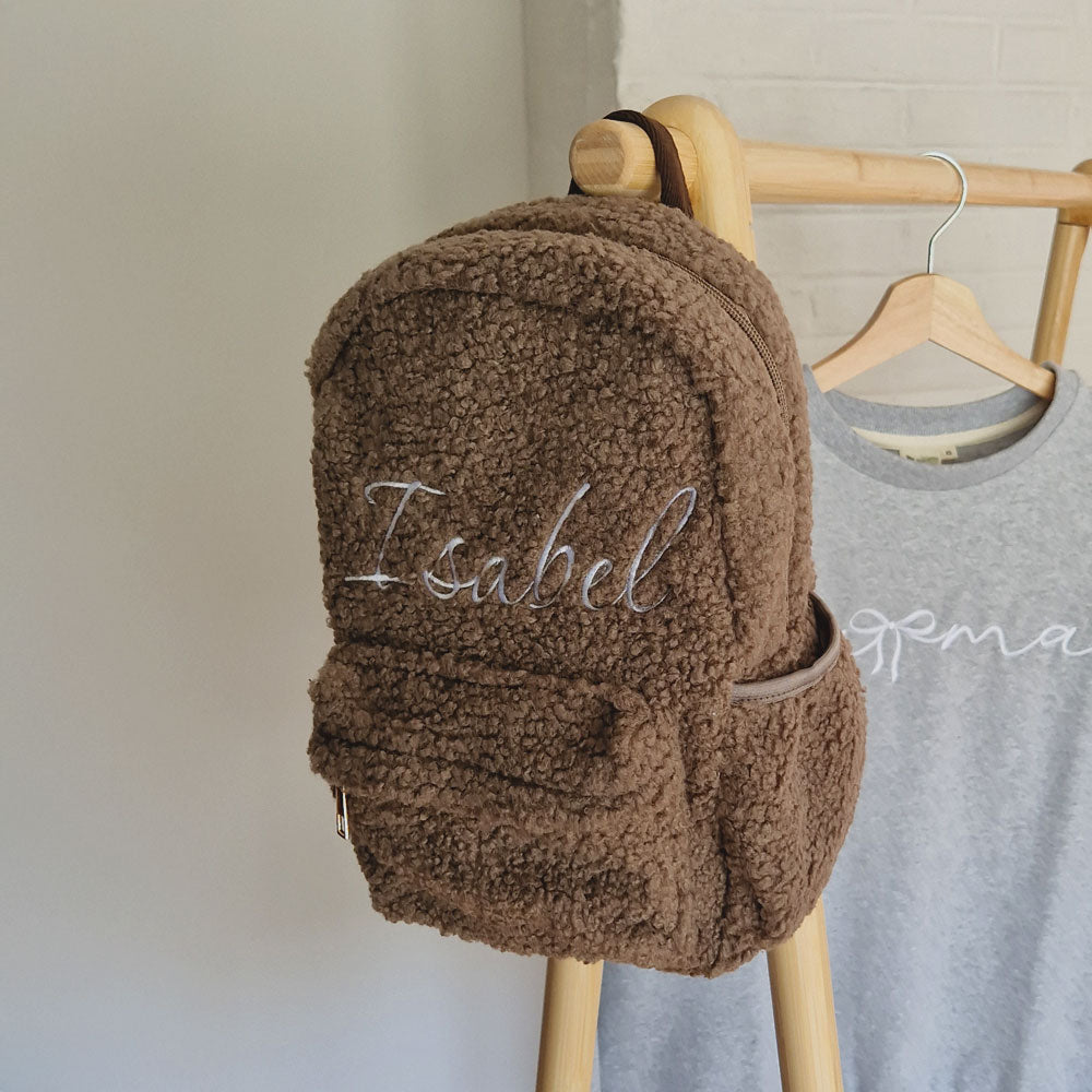 Gjør barnets hverdag litt mykere med vår fluffy ryggsekk – personlig brodert med barnets navn. Sekken har et mykt og koselig uttrykk, laget i populær teddystoff som føles god å bære og lett å kjenne igjen.